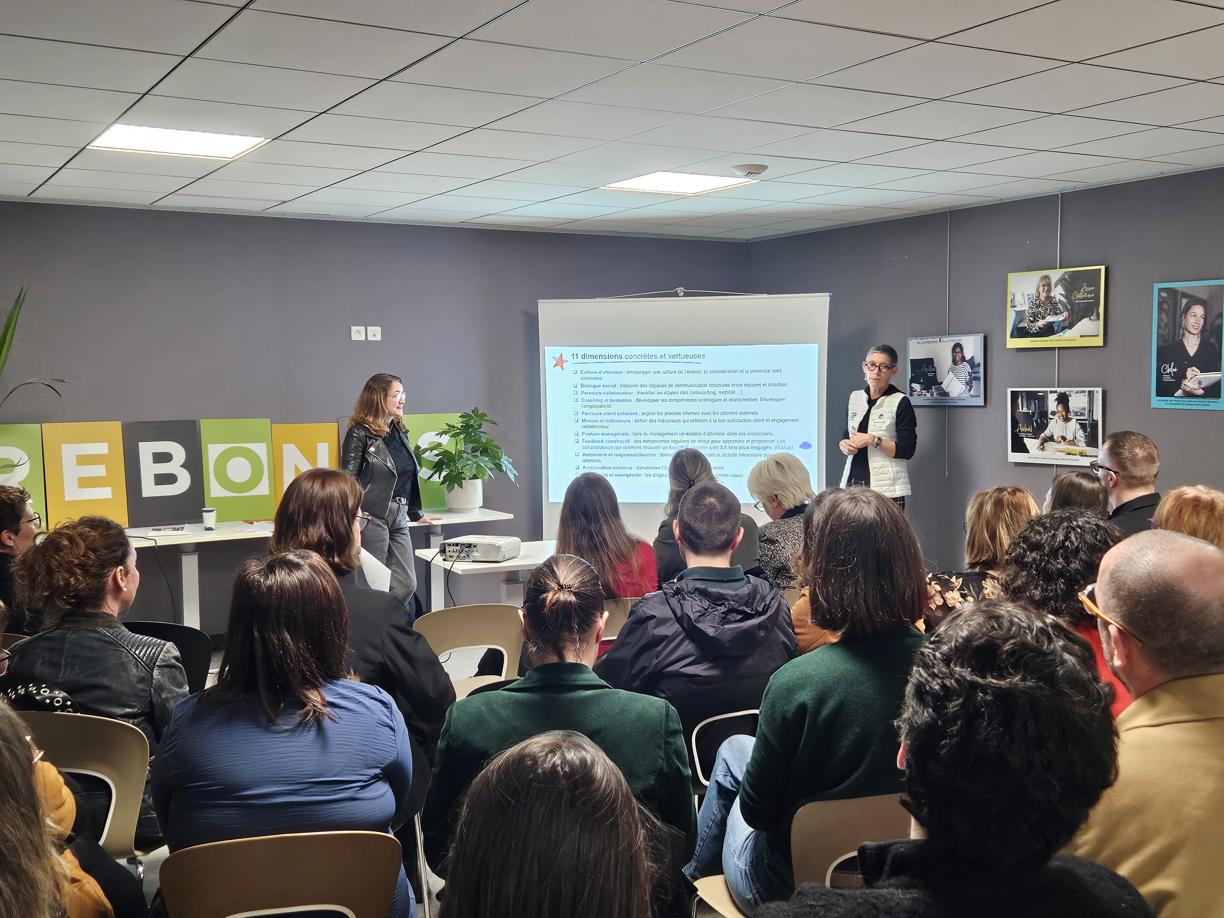 La conférence d’Hélène Scudeller Lucas, ainsi que les témoignages d’Emmanuelle Cadiou, Présidente du CREPI Finistère et de Maison Cadiou et de Nathalie Louail, DGA du Crédit Agricole du Finistère ont nourri les échanges autour de sujets clés : la relation, l’attention portée aux équipes, le management, le sens au travail.