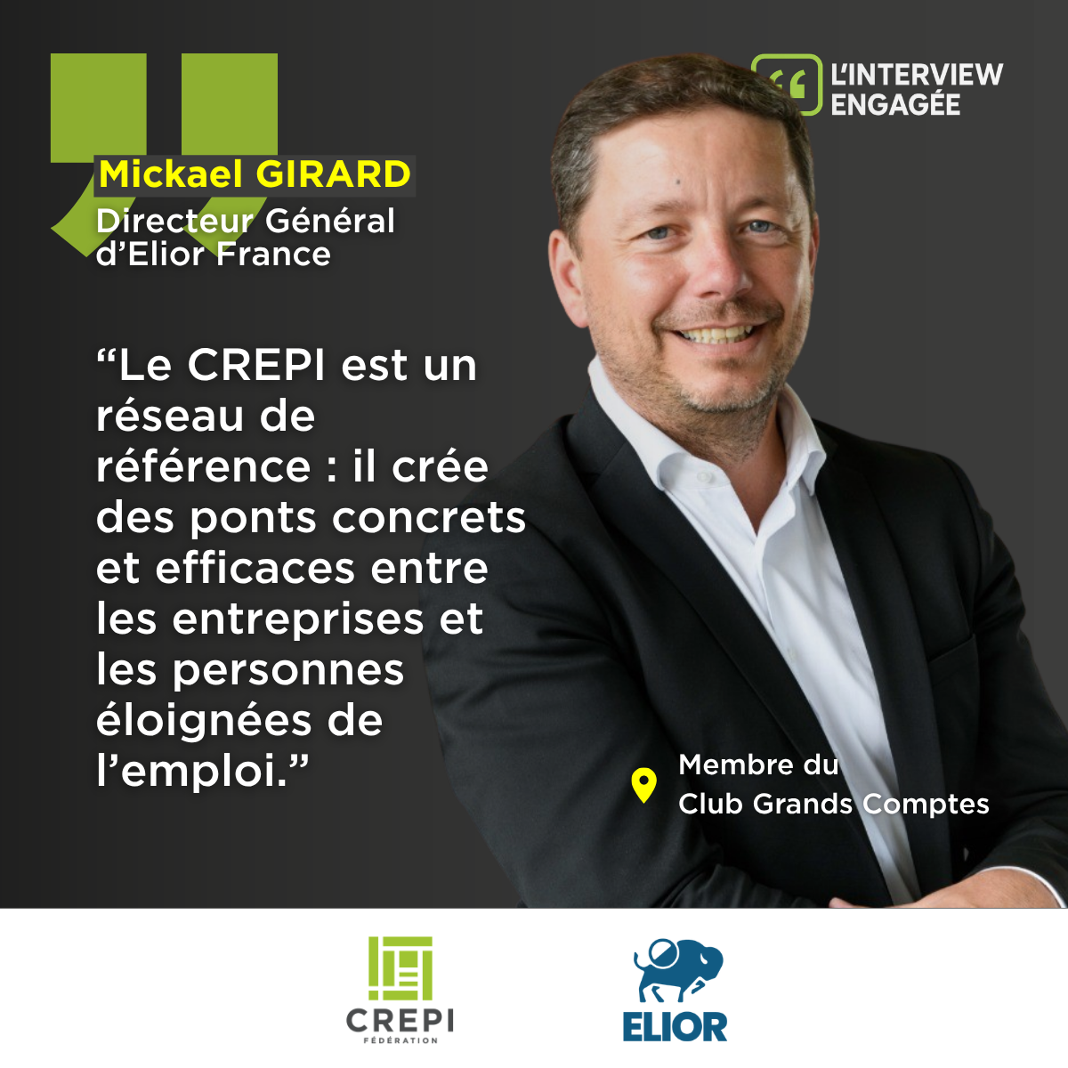 Elior, l’un des leaders européens de la restauration collective, est aujourd’hui présent dans 9 CREPI régionaux et membre du Club Grands Comptes de la Fédération nationale des CREPI. Mickaël Girard, son Directeur Général, revient sur cet engagement de longue date, sur la vision stratégique qui le sous-tend et sur ce que le Réseau CREPI apporte concrètement à une grande entreprise comme la sienne.