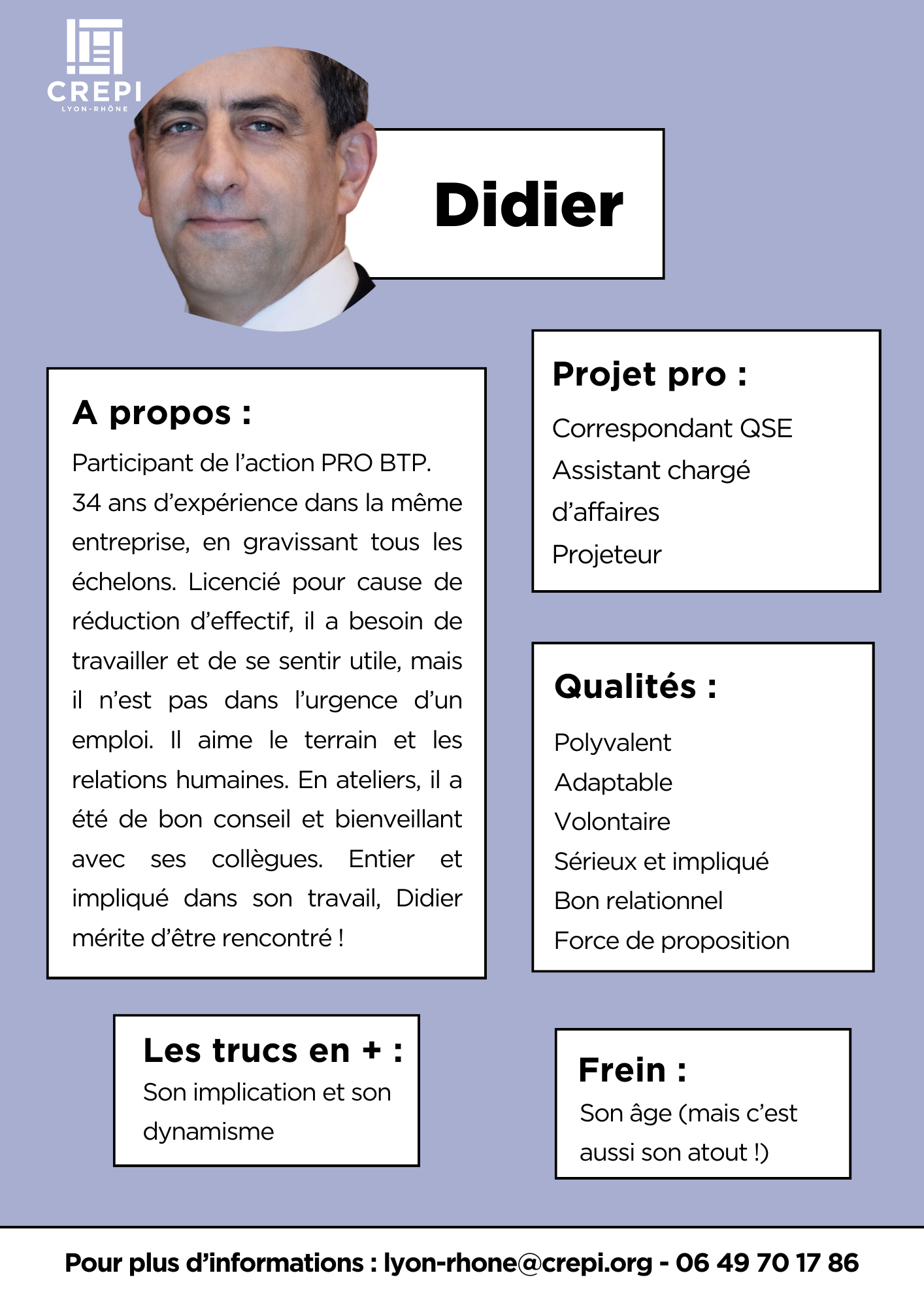 Un profil a attiré votre attention ? Contactez-nous au 06 49 70 17 86 ou par mail à lyon-rhone@crepi.org